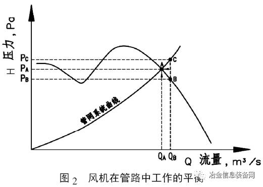 以圖2 為例,圖中的管網(wǎng)系統(tǒng)曲線表示在一定的管網(wǎng)條件下,輸送一定流量的氣體而要克服管道阻力所對(duì)應(yīng)的壓力。當(dāng)風(fēng)機(jī)在性能曲線上B 點(diǎn)運(yùn)行時(shí),對(duì)應(yīng)的風(fēng)機(jī)流量為QB,風(fēng)機(jī)出口壓力為PB;此時(shí),在管網(wǎng)系統(tǒng)中輸送流量為QB的氣體需要克服管道阻力而要求的氣體壓力為PC。由于PC>PB,風(fēng)機(jī)的出口流量將不斷減小直至QA,此時(shí)PC= PB=PA,風(fēng)機(jī)傳遞給氣體的能量與管道阻力達(dá)到平衡,通過(guò)自調(diào)節(jié)的平衡過(guò)程,風(fēng)機(jī)將在A 點(diǎn)穩(wěn)定運(yùn)行。