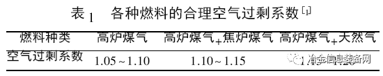 助燃風(fēng)機(jī)出口風(fēng)量由熱風(fēng)爐燒爐期間所需助燃空氣量決定,根據(jù)熱風(fēng)爐燃燒計(jì)算確定。為保證煤氣完全燃燒,助燃空氣實(shí)際用量要大于理論用量,其比值即空氣過(guò)剩系數(shù)。不同燃料種類所需要的空氣過(guò)剩系數(shù)見(jiàn)表1。