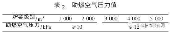 確定助燃風(fēng)機(jī)壓力時(shí),應(yīng)由包括余熱回收裝置在內(nèi)的系統(tǒng)流路阻損的計(jì)算確定。在《GB 50427-2008 高爐煉鐵工藝設(shè)計(jì)規(guī)范》中給出了各級(jí)別高爐的熱風(fēng)爐助燃空氣壓力值[7],如表2 所示。